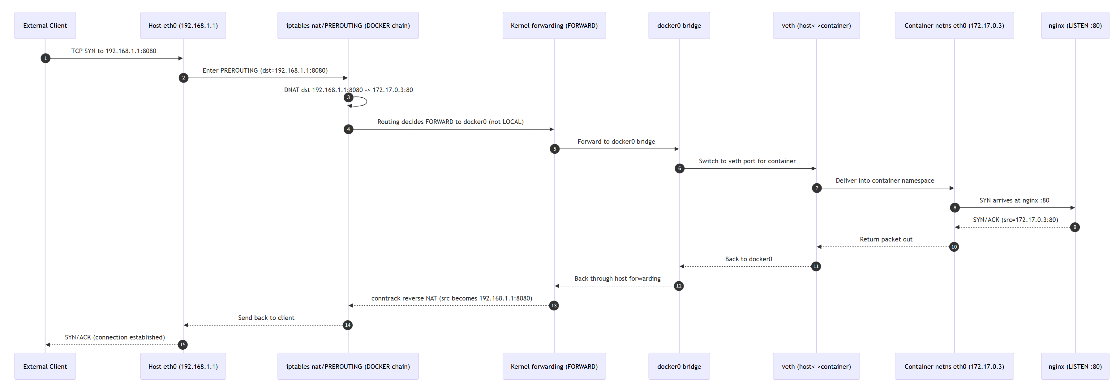 docker run nginx(그냥 띄움): 컨테이너:80은 컨테이너 내부에만, 외부HOST:80과 연결 없음-p 8080:80: 호스트 :8080 → 컨테이너 :80으로 DNAT(포트포워딩) 자동 생성- 컨테이너 egress는 ip_forward + MASQUERADE(SNAT) 로 성립