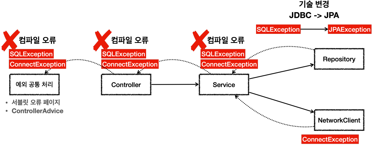 SQLException은 체크 예외인데, 이 예외는 JPA로 넘어가면 JPA관련 에러로 변경이 될 수 있어서, 상위에 있는 다른 함수들은 모두 이 코드를 수정해줘야 하는데, 이러한 문제점들을 어떻게 해결 가능한가?